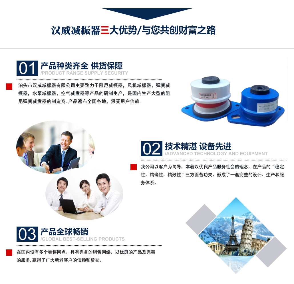 ?泊頭市漢威減振器有限公司主要致力于阻尼減振器,風(fēng)機(jī)減振器,彈簧減振器,水泵減振器,空氣減震器等產(chǎn)品的研制生產(chǎn),是國(guó)內(nèi)生產(chǎn)阻尼彈簧減震器的制造商,產(chǎn)品廣泛用于中央空調(diào)、通風(fēng)管道、鋼鐵、發(fā)電、石化、水泥和城市供熱等行業(yè)的各類(lèi)管道和設(shè)備上,并在全國(guó)多地工程上得到應(yīng)用,業(yè)績(jī)遍布全國(guó)多地,深受用戶(hù)信賴(lài). 公司主要減振器系列產(chǎn)品有:中央空調(diào)系列減振器、泵房系列減振器、管道系列減振器、風(fēng)機(jī)系列減振器、以及自行設(shè)計(jì)制作的系列隔振臺(tái)座。泊頭市漢威減震器科技有限公司擁有多名高素質(zhì)技術(shù)人員,擁有完善的阻尼彈簧減震器生產(chǎn)和檢驗(yàn)專(zhuān)用設(shè)備,擁有硅橡膠自動(dòng)擠出生產(chǎn)線,全自動(dòng)彈簧機(jī)等設(shè)備。生產(chǎn)條件逐漸完善進(jìn)步,努力擴(kuò)大生產(chǎn)規(guī)模,提高泊頭市減震器科技有限公司的生產(chǎn)競(jìng)爭(zhēng)力。 多年來(lái)漢威減振器以三誠(chéng)作為公司的字號(hào),旨在立足當(dāng)前......